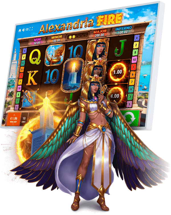 Alexandria Fire takes players to the eponymous city in Egypt, home to the famous Pharos lighthouse, one of the Seven Wonders of the Ancient World, and the legendary Library of Alexandria. Lighthouse scatters start twelve retriggerable free games, fire orbs initiate the massively powerful and bountiful Fire Respins, while two optional mini-features can significantly boost players’ payouts: the risk ladder and the card gamble.