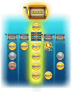 Collecting nets may randomly trigger this feature with three respins. If that happens, coins are not collected but transferred to a 4x4x6x4x4 grid instead. Each reel gets assigned one of the four bonus prizes, and only coins, boost symbols, and Pop’N Split symbols may land in this phase. Boost symbols upgrade the bonus prize on the same reel one tier up.
