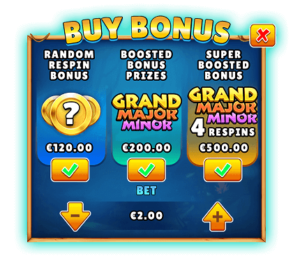 The normal bonus costs 60x bet and awards the bonus respin feature that follows normal feature rules. The boosted bonus costs 100x bet and awards the bonus respin feature with the lowest bonus prize removed. The super boosted bonus costs 250x bet and awards the bonus respin feature with the lowest bonus prize removed and the respins counter increased from three to four.