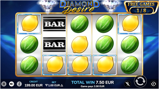 Land three shiny diamonds to win eight free games. Diamond symbols still count as wild and scatter, and now are sticky as well. Each new diamond landing on screen in this phase adds one more free game, contributing thus to the chance of filling up the grid with these gleaming gems.