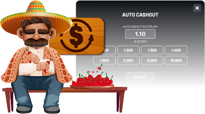 Place up to three simultaneous bets and optionally configure autoplay and auto cashout options. Then press the play icon on the competitor(s) to start the round and watch them munch on the chili peppers. Press Cashout before their head explodes from the unbearable spiciness to collect your win: if they drop out before you cash out, you lose your bet.
