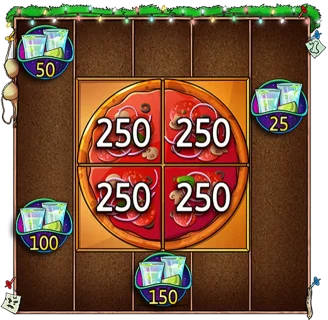 Pop N’ Split pizza symbols split into four frames with four randomly drawn values. The highest value is chosen and quadrupled to be come the symbol’s cash value.