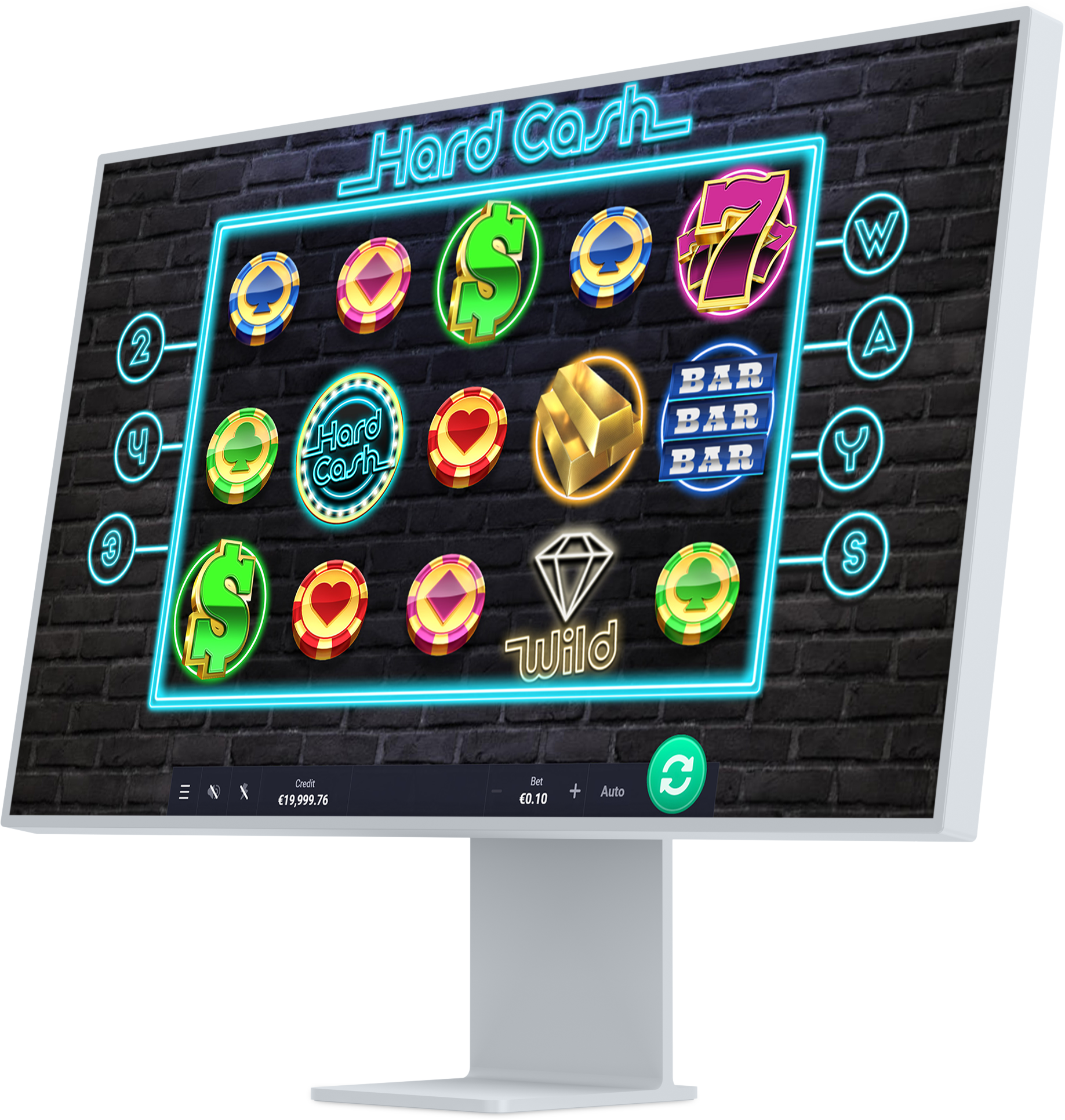 4 lowpay symbols are coloured and suited casino chips. 4 high-pays are the familiar dollar sign, golden bars, BAR and 7 symbols. The Neon Diamond Wild substitutes for all symbols except Scatter, and the Hard Cash Scatter triggers the Free Spins feature
