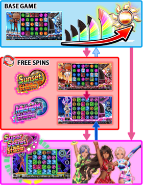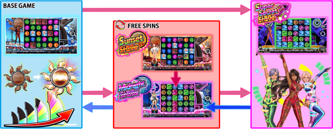 Free Spins play out in up to three stages. The Sunset Stage starts with 3 Free Spins. Players then proceed to the Midnight Stage with 5 additional Free Spins.